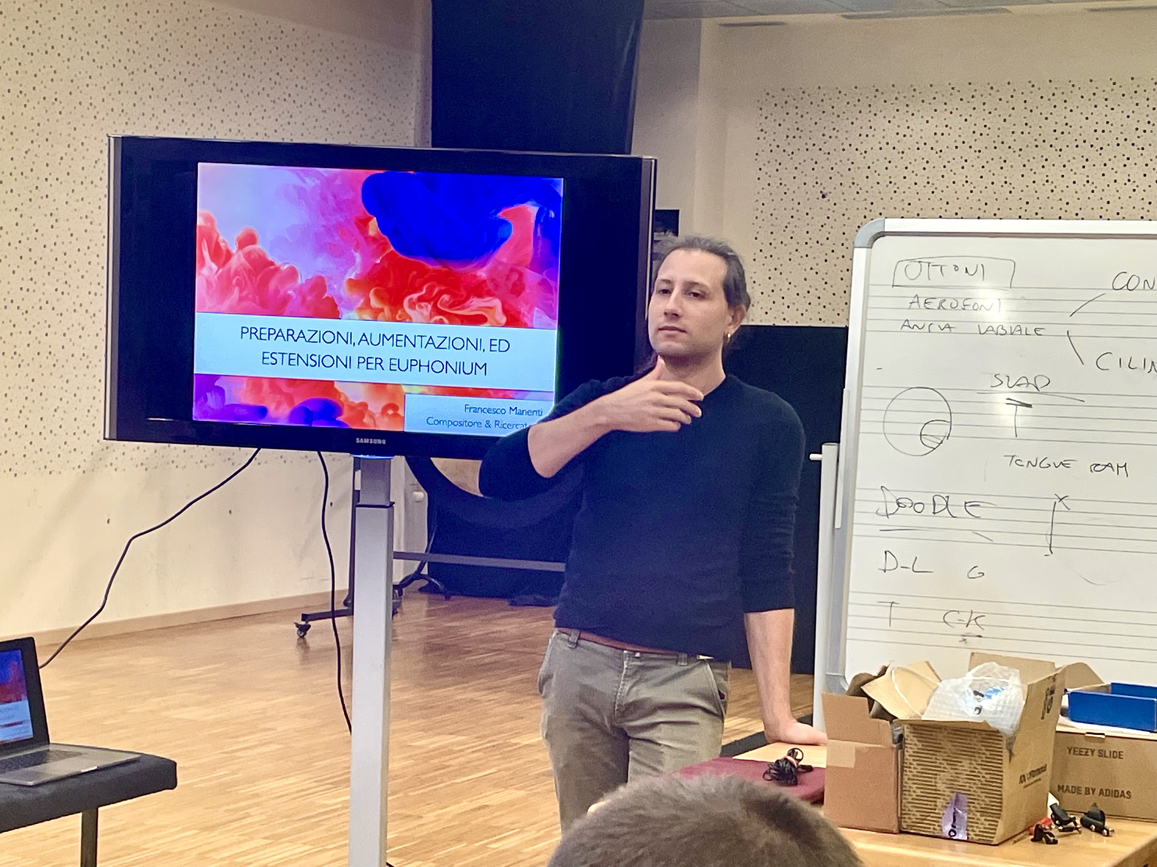 Francesco Manenti presenterà il lavoro di ricerca, svolto con Marina Boselli, sullo sviluppo delle preparazioni, aumentazioni ed estensioni per eufonio, con particolare attenzione all'impatto sulla pratica strumentale.