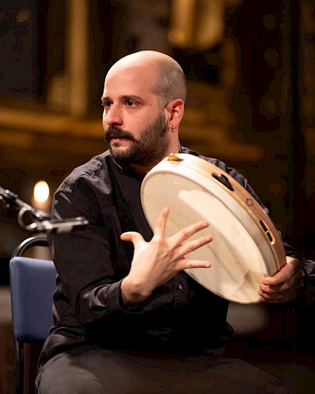 He attended and completed his studies at the Frame Drum Academy of the Tamburi Mundi Festival in Freiburg im Breisgau with Murat Coskun. His specialization in frame drums and other instruments (such as percussion idiophones, dulcimer, rubber harp, and various percussion keyboards) brought him closer to early and traditional music, in a constant search to cultivate dialogue and ideal exchange between the various fields he has acquired.